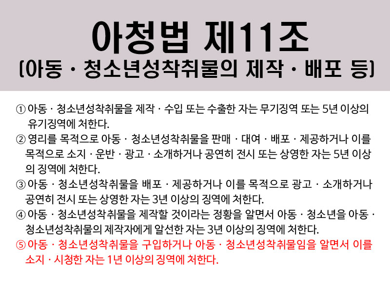아천법 위반 처벌은 이전보다 그 처벌 수위가 높아졌습니다.아동청소년 성착취물은 시청만 해도 1년 이상 징역형을 받을 수도 있고, 최소 15년 이상 성범죄자로 신상정보 등록을 하도록 법이 개정됐습니다.오늘은 이것에 대해 알아보도록 하겠습니다.